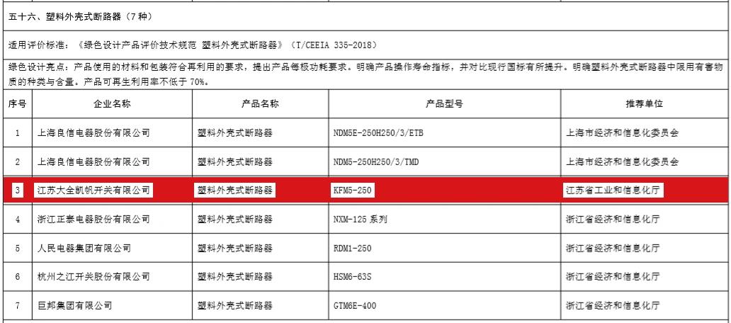 近日,國家工業(yè)和信息化辦公廳公布了第五批綠色制造名單,江蘇大全凱帆開關有限公司榜上有名,公司生產(chǎn)的KFM5-250塑料外殼式斷路器獲得國家級肯定,入選“綠色設計產(chǎn)品”名單。本批次綠色設計產(chǎn)品的塑料外殼式斷路器中,全國僅有6家企業(yè)的產(chǎn)品入圍。